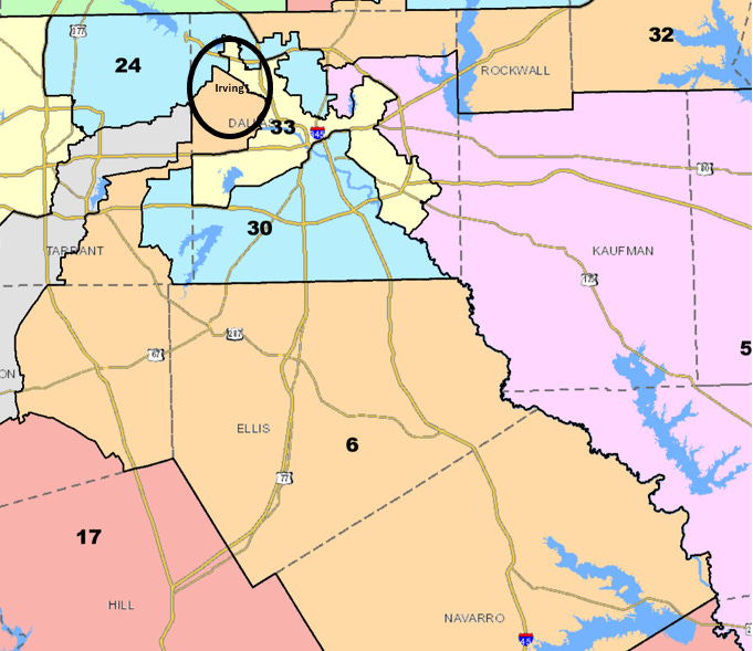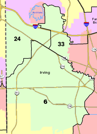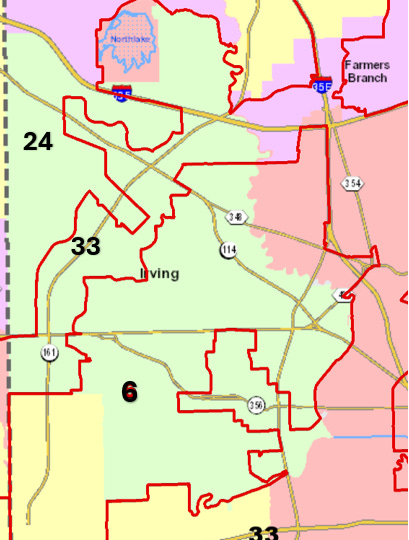 First a look at the current districts. These are going away, but right now Irving is currently split between CD-24 (Beth Van Duyne, R), CD-33 (Marc Veasey, D), and CD-6 (Jake Ellzey, R). District 24 is north Irving, 6 is central and south Irving, and 33 wraps around 6 in a strange fashion: