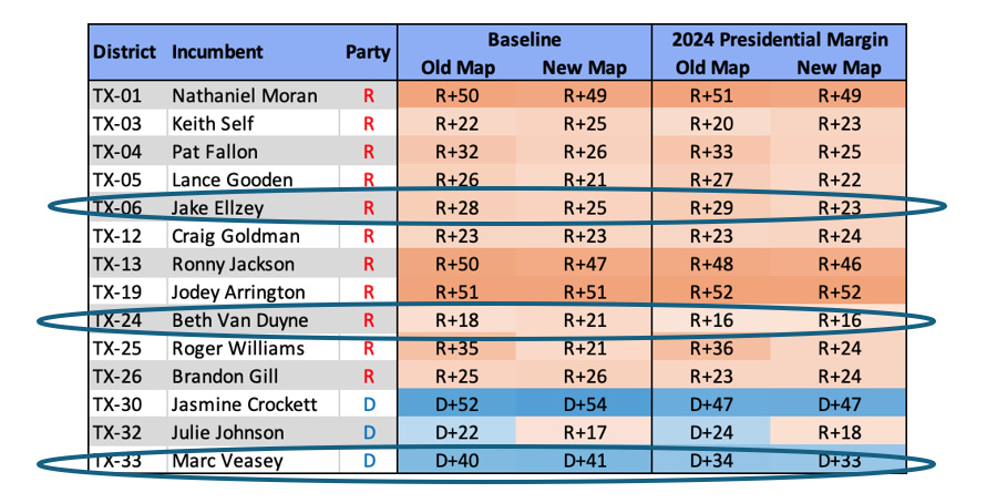 Here’s the analysis from Inside Elections, showing their measure of the baseline partisanship in each district, as well as how 2024 shook out, for the old and new maps: