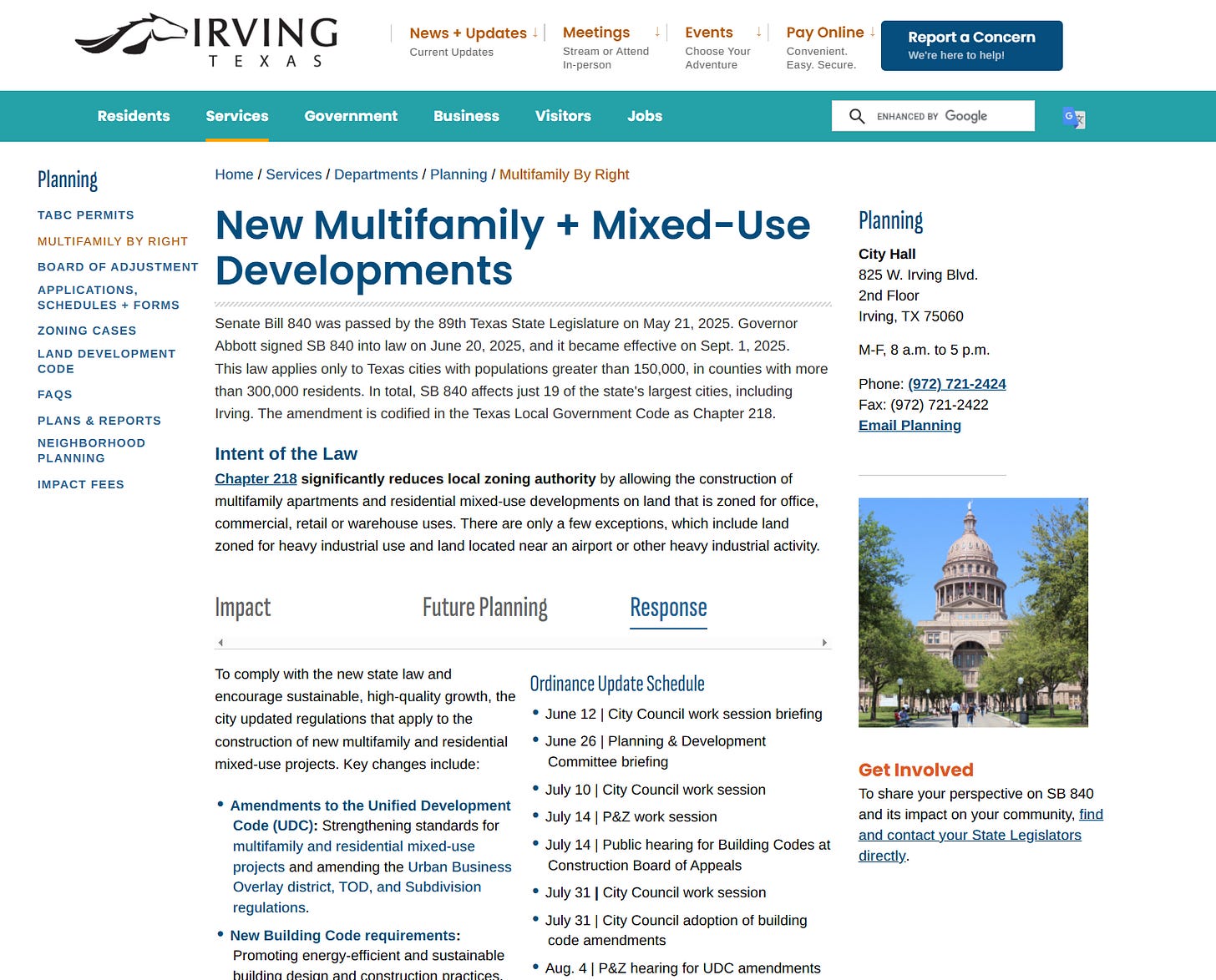 Basically, SB 840 could invite a surge of apartment projects in parts of Irving that were not planned for that level of residential use.