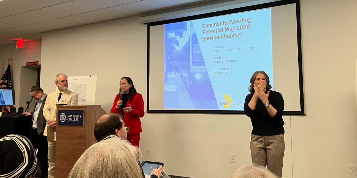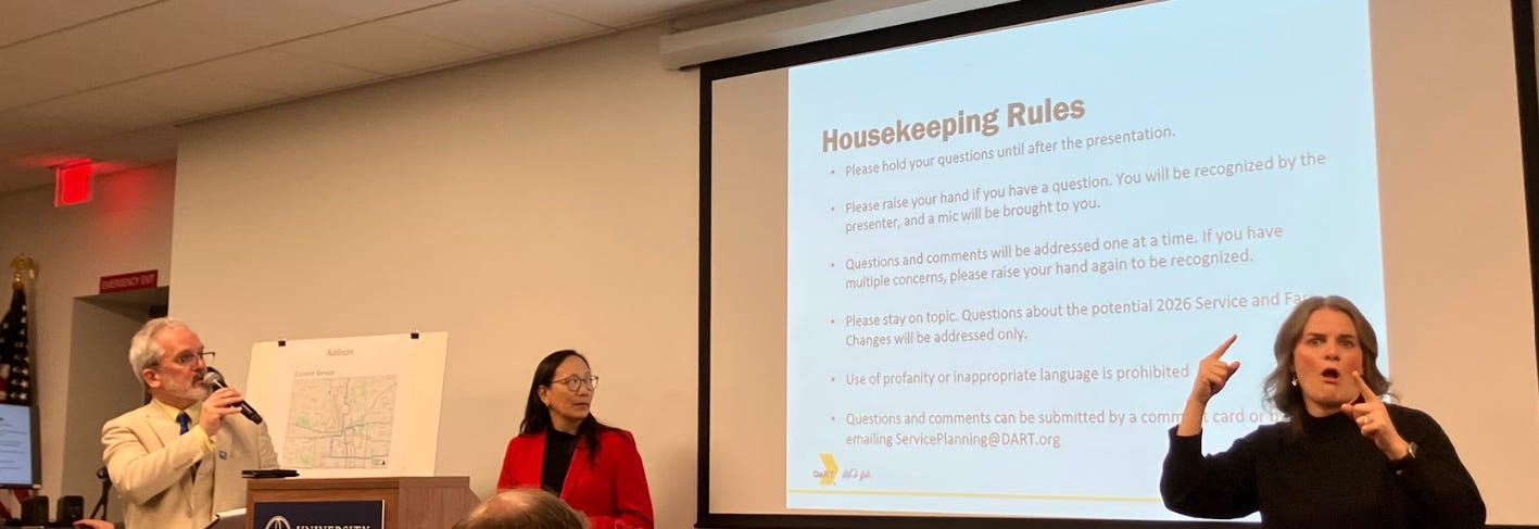 First of all, the meeting was weird. There were two sign language performers (taking turns signing to each other, as there did not appear to by any deaf citizens), a Spanish interpreter (also not used), three security officers, an oddly specific safety announcement at the beginning by a man in a three-piece suit, and a number of DART staff just milling around in the front of the room.