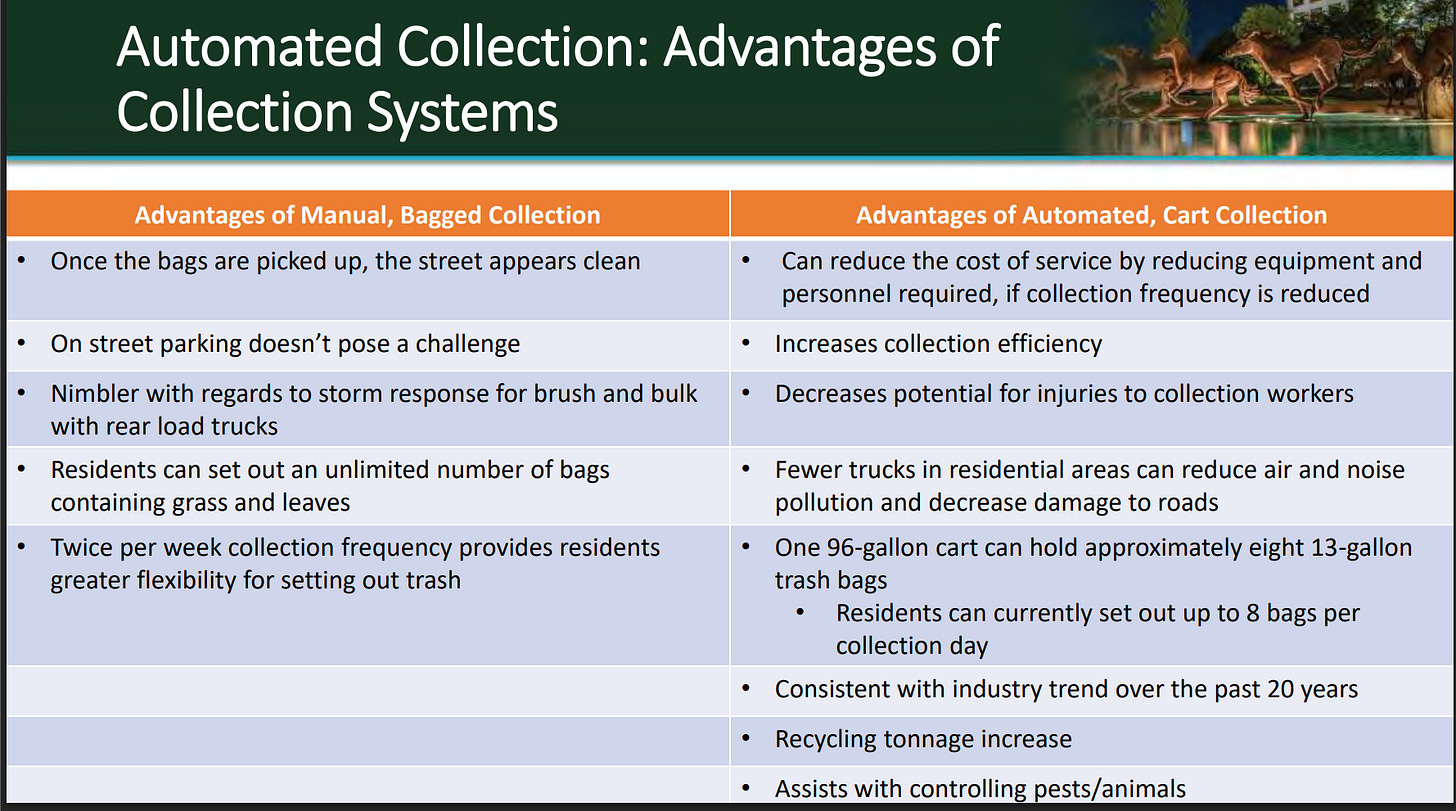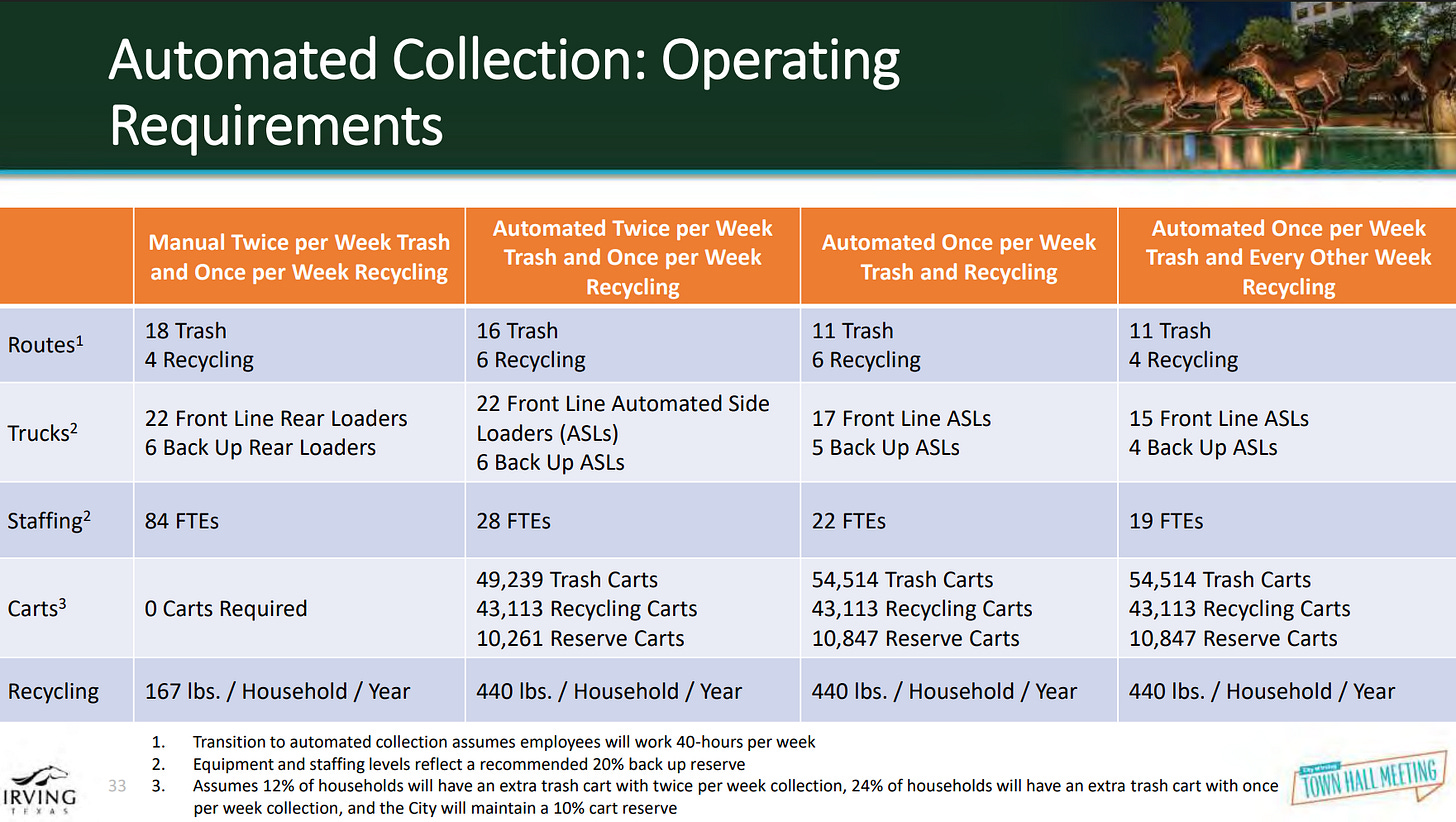 In 2022, Irving shifted to once-a-week collection temporarily, drawing negative feedback (and a vote of council to revert to 2x a week — thank you Councilman John Bloch)
