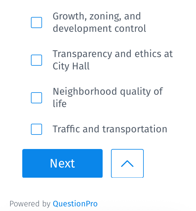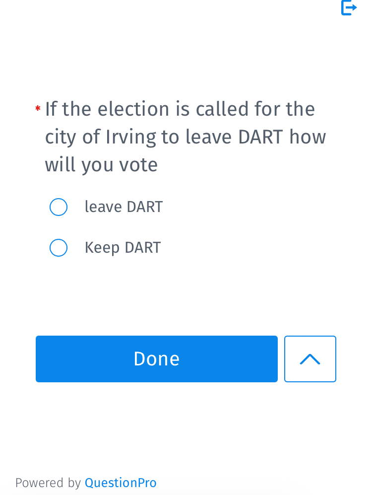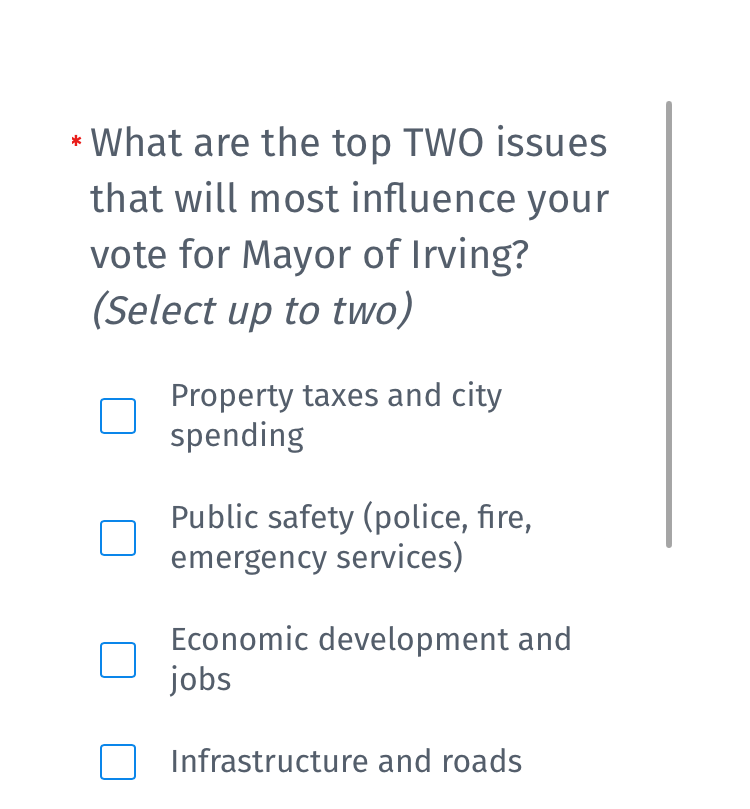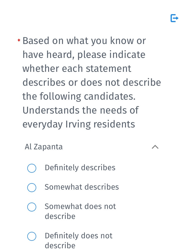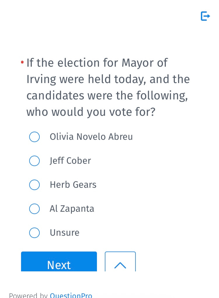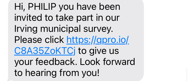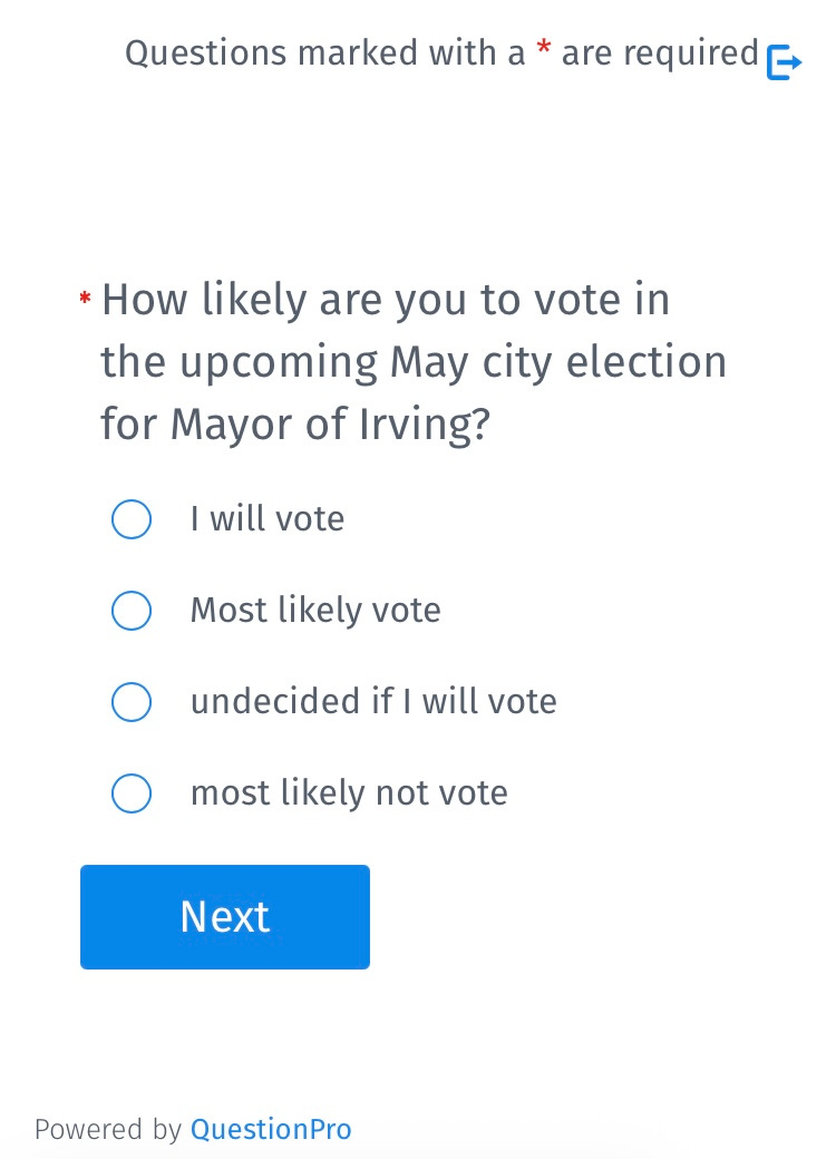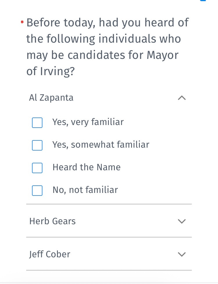 Interestingly, it also asks for “your current opinion” on the Mayor of Irving and also City Council: Excellent, Above Average, Average, Needs Improvement.